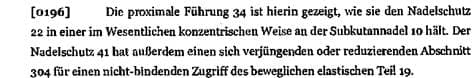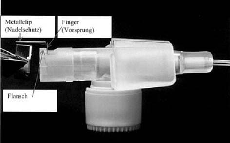 Das Merkmal e) („wobei sich der Nadelfänger des Nadelschutzes über das spitze distale Ende der Nadel vorwärts bewegt und dadurch das spitze distale Ende abdeckt, wenn der Nadelschutz nach vorne in die Nähe des spitzen distalen Endes der Nadel gedrückt wird“) definiert die Richtung der „Vorwärtsbewegung“ des Nadelfängers nicht. Ob die Vorwärtsbewegung nun normal zur Nadelachse geschieht oder parallel dazu ist daher unerheblich, solange sie zur Abdeckung des Nadelendes führt.
