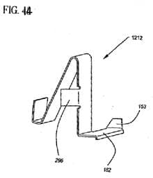 Ebenso klar geht der Arm aus dem Patent EP 1 292 355 B1 der Beklagten hervor, dort zB Fig 5 7, 14, Bezugszeichen 152. Der Nadelfänger besteht aus dem Federarm 151 und der Lasche 296. Vgl auch folgende Figuren: