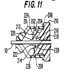 Auch in D3 fehlt ein Arm im Sinne des Streitpatents, also ein sich in Längsrichtung der Vorrichtung erstreckender langgestreckter Körper. Der Nadelfänger ist jener Teil, der eine Verletzung an der Nadelspitze verhindert, er besteht in D3 aus den ineinandergreifenden Zähnen 212, 222. Teile des Nadelfängers – also dieser Zähne – als „Arm“ zu interpretieren, der an dem Nadelfänger sich in Längsrichtung erstreckend anschließt, ist eine künstliche Interpretation von D3. Wie bei D1 fehlt auch bei D3 das Merkmal des Arms im Sinne des Streitpatents.