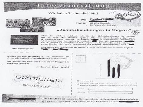 b) Flugblätter, in denen Zahnbehandlungen beworben werden, z.B. durch die Ankündigung einer Infoveranstaltung über Zahnbehandlungen in Ungarn, in Österreich zu verteilen und/oder verteilen zu lassen;