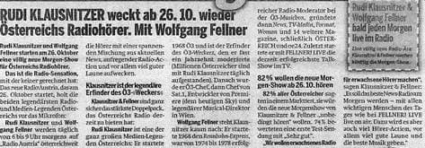 [4] Am 13. 9. 2019 erschien in der Zeitung der Erstbeklagten auf Seite 4 nach der Überschrift „Die neue Show der Radio-Legenden“ samt Fotos von Rudi Klausnitzer und Wolfgang Fellner folgender Artikel: