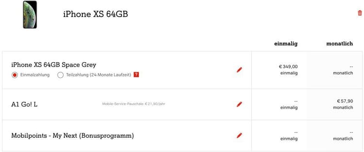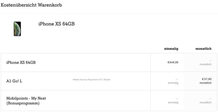 [3] Auf der Website der Beklagten https://www.a1.net (Stand: 28. 12. 2018) konnten Konsumenten unter dem Menüeintrag „Handys mit Vertrag“ insbesondere das „Apple iPhone XS 64 GB“ auswählen. Klickte der Konsument unter dem „Apple iPhone XS 64 GB“ auf den Button „Details“, wurden Kosten von „€ 57,90/Monat“ und der Gerätepreis von „einmalig € 349,00“ angezeigt. Diese Preise galten für den Kauf des Telefons bei gleichzeitigem Abschluss des Tarifs „A1 Go! L“ mit 24 monatiger Vertragsbindung.