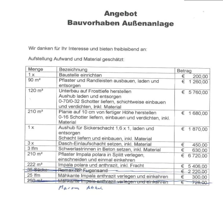 Dieses wurde von den beiden Streitparteien überarbeitet. In in diesem Zusammenhang wurden die ersichtlichen Streichungen – Fugensand, Mähkante, Humusieren für Rollrasen und Verlegen des Rollrasens sowie Rollrasen, inkl. Fracht – vorgenommen.