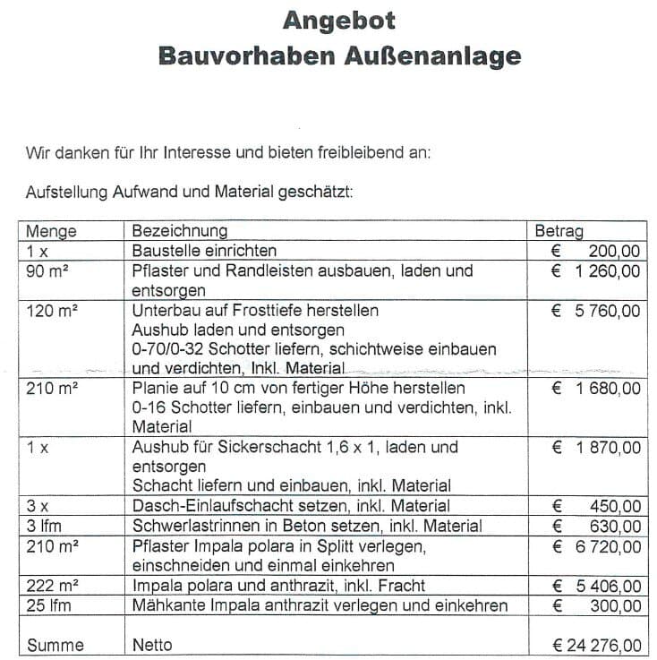 Bei der schriftlichen Angebotslegung wurde hinsichtlich der Errichtung des Oberbaus lediglich die Auswahl der Pflastersteine besprochen. Auch hinsichtlich der Wasserableitung wurden nichts Konkretes besprochen.