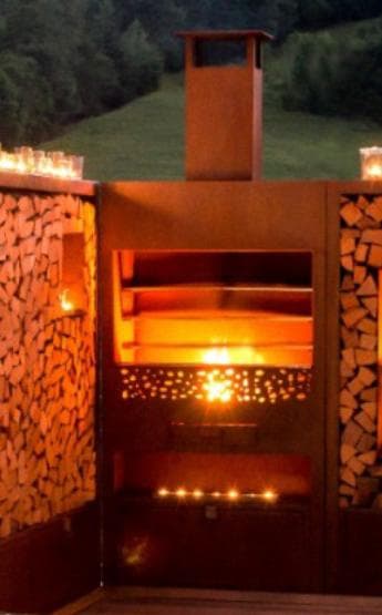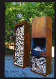 Kaminöfen aus Metall zur Nutzung im Freien werden von Dritten in vielen Varianten angeboten, die sich optisch schon auf den ersten Blick deutlich durch die Proportionen des Korpus sowie unterschiedliche Platzierungen, Längen, Breiten und Querschnitte der Rauchfänge unterscheiden. Zum Teil sehen auch sie Möglichkeiten zur Holzlagerung vor, etwa durch Nutzung eines Freiraums unter dem Feuerraum, durch eine diagonale Teilung des Korpus in Feuerraum und Holzlagerfach oder durch Holzlagerfächer, die durch breite Flächen optisch deutlich vom Feuerraum getrennt sind (./8).