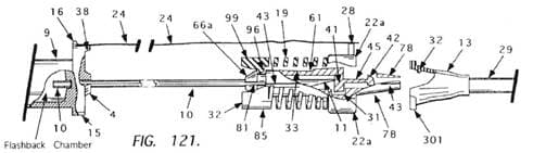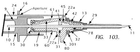 Von den im Klagspatent angeführten Möglichkeiten zur Erzielung einer bestimmten technischen Wirkung, nämlich das lösbare Halten des Katheteransatzes durch den Arm, werden in der Beschreibung lediglich der „Kanal 32” in Verbindung mit den Fig 103 bis 105 und die „Hinterschneidung” in Verbindung mit Fig 121 näher definiert.