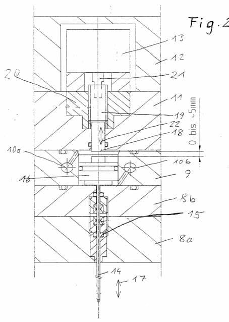 […] [0017] In Fig. 2 ist eine Verstellvorrichtung für den Anschlag der Düsennadel 14 im Detail dargestellt. Die Düsennadel 14 dient in bekannter Weise zum Verschließen einer Düsenöffnung, um Beginn und Ende des Einspritzvorganges genau definiert zu ermöglichen. Dichtungen 15 dienen dazu, ein Aufsteigen des Materials beim Spritzgießvorgang über die Platten 8a, 8b hinaus zu verhindern. Ein Kolben 16 dient zur Betätigung der Düsennadel 14. Dazu wird über Kanäle 10a, 10b Druckluft zugeführt, um die Düsennadel 14 in Richtung des Doppelpfeils 17 zu bewegen. An der Oberseite des Kolbens 16 ist ein verstellbarer Anschlag 18 vorgesehen, der an einer Schraubspindel 19 befestigt ist, die in einem Einsatz 20 der Platte 11 gehalten ist. Ein Wellenstummel 21 des Motors 13 greift in die Schraubspindel 19 ein und verdreht diese so, dass sich der Anschlag 18 in Axialrichtung (Doppelpfeil 22) bewegt.