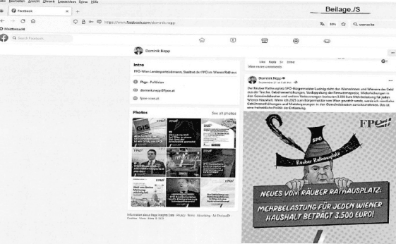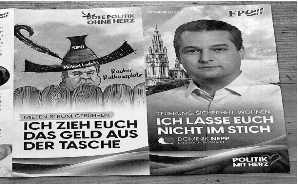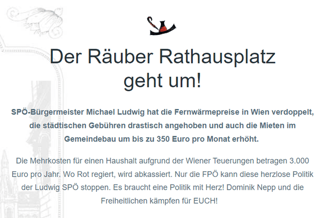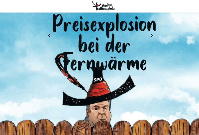 Es folgen Fenster mit dem Titel „Fernwärmepreise verdoppelt“, „Gebührenwahnsinn stoppen“, „Mietwucher im Gemeindebau“ und „Gas und Strompreise explodieren“, die, wenn man die in diesen Fenstern angebrachte Abspielzeile drückt, neuerlich eine mit dem erwähnten Hut versehene Darstellung eines Mannes hinter einem Zaun zeigen, wobei in diesem Hut die Worte „SPÖ“ und „Michael Ludwig“ eingefügt sind.