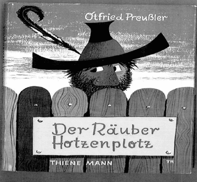 Die Cover dieser Bücher zeigen die Figur des „Räuber Hotzenplotz“ mit groß dimensioniertem, schwarzem Hut mit hoch gebogener Krempe, rotem Hutband und großer Feder, hinter einem Zaun stehend, wie folgt: