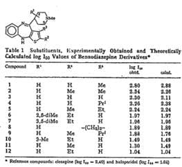 2.3.1 Beilage ./7 untersucht den Einfluss von unterschiedlichen Substituenten bei Thienobenzazepinen auf ihre antipsychotische Wirkung. Unter dem Titel „A Free-Wilson Study of 4-Piperazinyl-10H-thienobenzodiazepine Analogues“ werden gemessene und berechnete Dopinamin-Rezeptor-Bindungs-daten von Benzodiazepinen verglichen. Diese Dopinamin-Rezeptor-Bin-dungsdaten korrelieren mit der antipsychotischen Aktivität und extrapyramidalen Nebenwirkungen und wurden von 12 Verbindungen in Referenz zu Clozapin und Haloperidol gemessen. Die Daten werden in Tabellenform mit einer Strukturformel präsentiert: