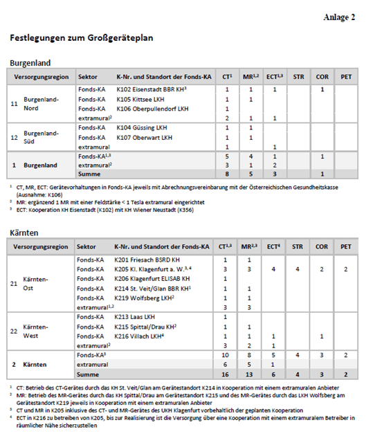 11. Standort- und Kapazitätsplanung von Großgeräten mit überregionaler Bedeutung (insbesondere Strahlentherapiegeräte, Coronarangiographie-Anlagen und Positronen-Emissions-Tomographiegeräte) ist auf Bundesebene zu vereinbaren; weiters die standortbezogene und mit den Versorgungsaufträgen auf regionaler Ebene abgestimmte Planung der übrigen medizinisch-technischen Großgeräte;
