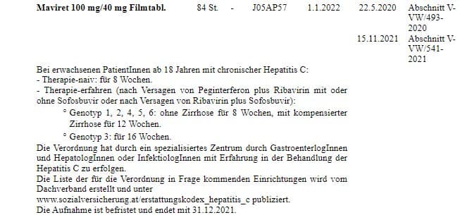 'Die befristete Aufnahme von 2 Jahren ergab sich aus der mangelnden Evidenz und Datenlage für Österreich. Zu diesem Zeitpunkt lagen keine Studiendaten von Maviret®, bezüglich der Wirksamkeit (SVR-12 Raten) und Sicherheit, auch in der tatsächlichen Behandlungspraxis ("real-life") vor.'