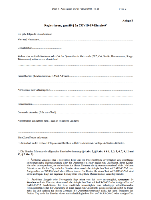 §2a. (1) Personen, die nach Österreich einreisen, sind verpflichtet, vor der Einreise durch Registrierung folgende Daten gemäß §25a Epidemiegesetz 1950 (EpiG) bekannt zu geben: