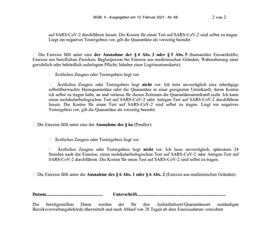 (2) Die Quarantäne kann zum Zweck der Ausreise aus Österreich vorzeitig beendet werden, wenn sichergestellt ist, dass bei der Ausreise das Infektionsrisiko größtmöglich minimiert wird.