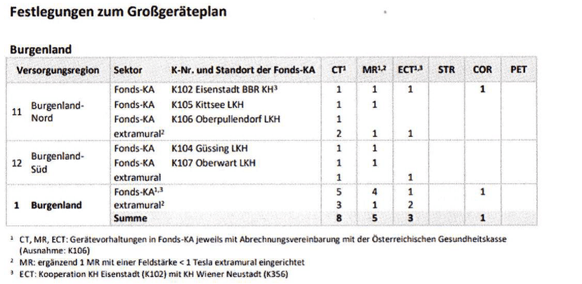 9 Die Revisionswerberin habe die Auffassung vertreten, § 7 Abs. 4 Bgld. KAG 2000 erfasse nur Geräte, die innerhalb der im Großgeräteplan festgelegten Anzahl lägen. Dagegen spreche schon der Wortlaut dieser Bestimmung, welche nur so ausgelegt werden könne, dass zu prüfen sei, ob die in der Verordnung festgelegte Anzahl an Geräten bereits bestehe. Wenn dies der Fall sei, sei kein Bedarf gegeben. Da die gegenständliche Verordnung auf MR Geräte und CT Geräte im extramuralen Bereich in der Versorgungsregion 11 Bezug nehme und konkrete Zahlen festlege, sei das Vorhaben in der Verordnung geregelt. Es gebe weder im Gesetzestext noch in den Erläuterungen einen Hinweis darauf, dass der Großgeräteplan eine Mindestanzahl festlege. Durch die verbindliche Festlegung des Bedarfs an den einschlägigen Geräten im extramuralen Bereich in der Versorgungregion 11 bestehe kein Raum für eine darüberhinausgehende Prüfung.