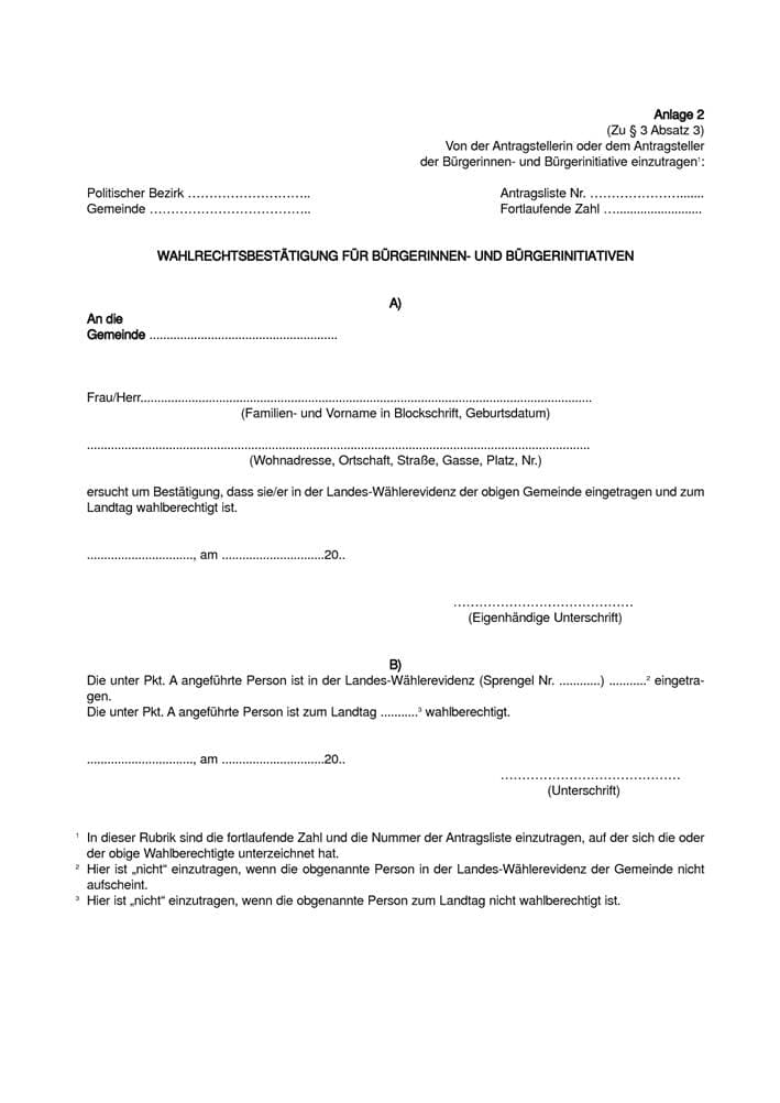 (3) Den Antragslisten ist für jede Befürworterin und jeden Befürworter eine Bestätigung der Gemeinde anzuschließen, dass diese oder dieser in der Landes-Wählerevidenz eingetragen und zum Landtag wahlberechtigt ist (Muster Anlage 2). Die Gemeinden haben solche Bestätigungen auf Verlangen unverzüglich auszustellen.