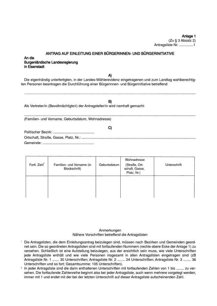 (2) Die Befürworterinnen und Befürworter der Initiative (§ 2 Absatz 1) haben sich eigenhändig unter Angabe ihres Familien- und Vornamens, des Geburtsdatums und ihrer Wohnadresse in Antragslisten (Muster Anlage 1) einzutragen. Die Antragslisten sind fortlaufend zu numerieren.