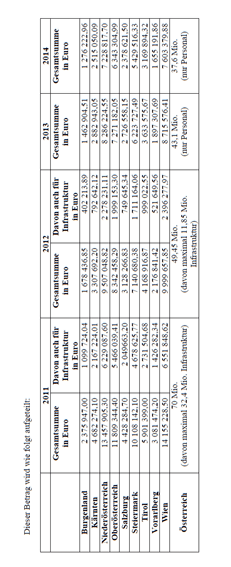 Anderenfalls ist dieser Zweckzuschuss in den Jahren 2011 bis 2014 als Anschubfinanzierung von Personalkosten im Freizeitbereich der schulischen Tagesbetreuung nach Maßgabe des oben angeführten Verteilungsschlüssels zu verwenden, wobei 8 000 Euro pro Gruppe pro Jahr nicht überschritten werden dürfen. Die für das Jahr 2014 vorgesehenen Mittel in der Höhe von 37,6 Mio. Euro können auch für Infrastrukturmaßnahmen verwendet werden, wobei 50.000,00 Euro als einmalige Zahlung pro Gruppe nicht überschritten werden dürfen.