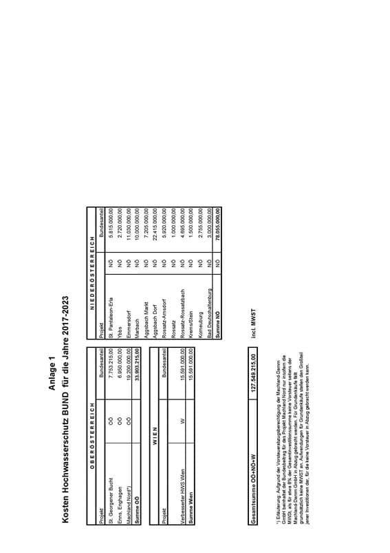 Die Vereinbarungsparteien verpflichten sich, die zur Vervollständigung des Hochwasserschutzes im Bereich der österreichischen Donau erforderlichen Maßnahmen im Zeitraum 2017 bis 2023 durch die Gewährung von nicht rückzahlbaren Beiträgen gemäß den Bestimmungen des Wasserbautenförderungsgesetzes 1985, BGBl. Nr. 148/1985, zu fördern. Die geplanten Projekte und dazugehörigen Studien, auf deren Grundlage diese Vervollständigung des Hochwasserschutzes durchgeführt werden soll, sind aus der Anlage 1 ersichtlich.