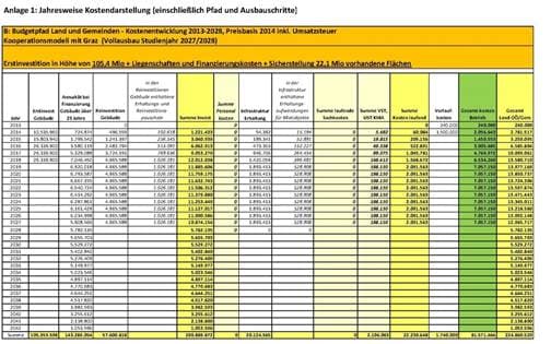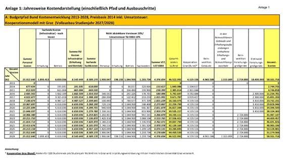 5. in Abstimmung mit der finanziellen Beteiligung des Landes Oberösterreich im Rahmen der künftigen Leistungsvereinbarungen mit der Universität Linz auch die Erfordernisse für den Lehr- und Forschungsbetrieb an einer Medizinischen Fakultät der Universität Linz einschließlich der Kosten der Beteiligung der Medizinischen Universität Graz oder einer anderen österreichischen universitären medizinischen Einrichtung an der Durchführung des Studiums (Art. 1 Abs. 2 und 3) berücksichtigt und zu diesem Zweck ab dem Jahr 2014 die sich aus der Aufstellung „Pfad und Ausbauschritte“ in Anlage 1 ergebenden Beträge für die einzelnen Jahre in der jeweiligen Leistungsvereinbarung mit der Universität Linz und hinsichtlich der Kooperationstätigkeiten in der jeweiligen Leistungsvereinbarung mit der Medizinischen Universität Graz oder einer anderen österreichischen universitären medizinischen Einrichtung zur Verfügung stellt; eine Überschreitung der jeweils in Anlage 1 ausgewiesenen Beträge wird beiderseitig ausgeschlossen,