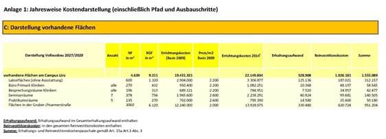(3) Weiters stellt das Land Oberösterreich bestehende Flächen, die das Land auch von Dritten auf sein Risiko anmieten kann, der Universität Linz zur Verfügung und hält diese entsprechend Abs. 1 Z 7 in einem dem aktuellen wissenschaftlichen Standard entsprechenden Zustand. Ab 2028 wird der Bund dem Land Oberösterreich im Wege der Universität Linz für diese Flächen eine Erhaltungs- und Reinvestitionspauschale in Höhe von 1.555.089 Euro brutto leisten, die für das Jahr 2028 in dem Betrag laut „Pfad und Ausbauschritte“ in Anlage 1 bereits enthalten ist.