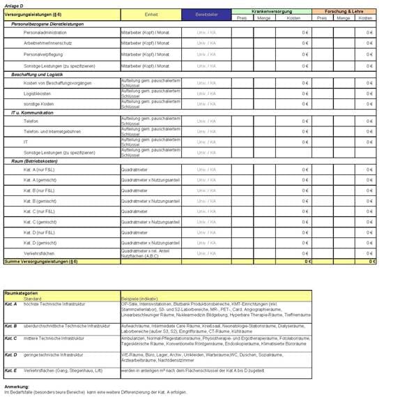 wird vom Bund Kostenersatz in dem Ausmaß geleistet, der dem Verbrauch bzw. der Inanspruchnahme der Versorgungsleistungen durch den Lehr- und Forschungsbetrieb der Universität entspricht. Soweit möglich, ist der Verbrauch bzw. die Nutzung mit den geeigneten technischen Hilfsmitteln zu ermitteln. Bei der Anwendung der Anlage D ist in der Position „Raum (Betriebskosten)“ bei Kategorie A nach Maßgabe der technischen Infrastruktur der Räume eine weitere Untergliederung möglich.